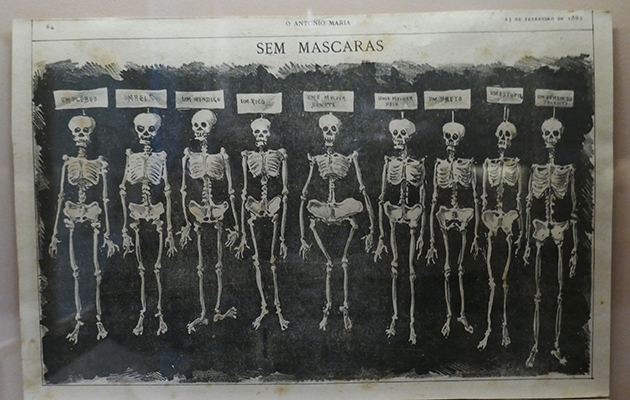 A igualdade do género humano só existe apenas na "hora da morte", poderia a lengenda deste desenho. Com excepção dos quadris (ancas) de uma "mulher bonita, observando os esqueletos nenhuma diferença se destaca entre um plebeu e um rei, um mendigo e um rico, uma mullher bonita e uma mulher feia, um preto, um estupido e um homem de talento. A não comparação de um preto com um branco, por exemplo, não deixa de ser significativo da ambiguidade como aborda a questão da hierarquia das raças, então muito em voga nos meios cientificos. "Sem Nascaras",O António Maria, 23/02/1882.