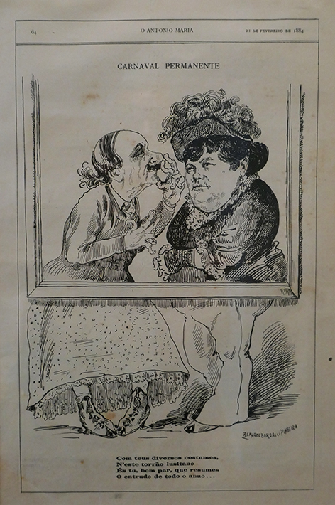 Uma das várias novidades da nova exposição é a forma como Bordalo aborda a questão da homossexualidade: um "entrudo de todo o ano". A questão da liberdade sexual dificilmente a poderia admitir, mas também não a condena explicitamente. Foca-se apenas na ideia que alguns homens assumem, durante todo o ano, o papel de mulheres e vice-versa. Caricatura do politico Marquês de Valada e da escritora Guiomar Torresão, in O António Maria, 21/02/1884.