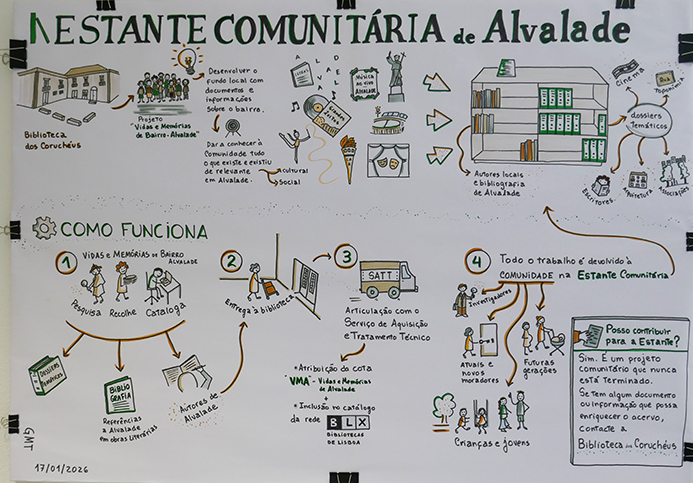 A vida de uma comunidade faz-se muitas vezes de pequenas coisas geradores de sentimentos de pertença, como encontros de moradores para partilharem memórias locais. A Biblioteca do Coruchéus, pouco antes da Pandemia (2020), promoveu estes encontros que denominou Vidas e Memórias de Alvalade. Algumas personalidades foram convidadas a falarem sobre Alvalade e as suas vivências no bairro. Havia já na altura a clara intenção de criar um registo do que era partilhado. Em 2022, como demos conta, foi criada uma Estante Comunitária, com alguns livros publicados sobre o bairro ou escritos por de moradores. Aos poucos foi-se delineando a criação de um pequeno grupo de investigação sobre Alvalade. Em 2026, a Estante Comunitária adquiriu outra dimensão. Para além de livros, temos agora dossiers com fichas sobre vários temas relacionados com Alvalade. Os objectivos propostos aos participantes são de uma verdadeira oficina de historiadores, como o cartaz documenta. Mais