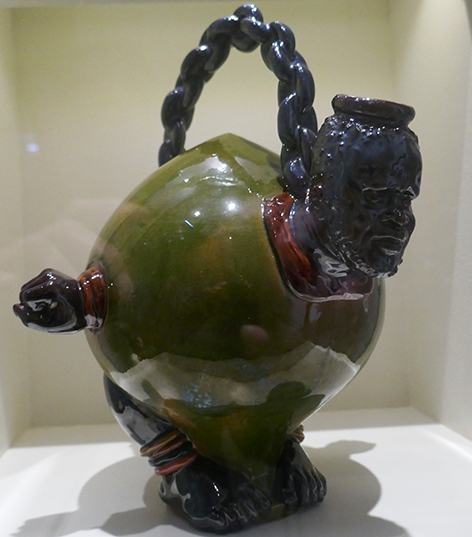 Caricatura de Moringue Gungunhana (Mudungazi ou Mundagaz), imperador de Gaza (norte de Moçambique), liderou a revolta contra o domínio dos portugueses. Foi então enviada uma expedição militar, comandada por António Anes, e que integrava Mouzinho de Albuquerque, Paiva Couceiro e Caldas Xavier. Após vários confrontos foi capturado em Chaimite (1895). Foi trazido para Portugal, sendo exibido em Lisboa como um troféu de caça, ficou preso no forte do Monsanto, sendo depois levado para Angra do Heroismo, na Ilha Terceira (Açores), onde faleceu em 1906. Os seus restos mortais foram trasladados para Moçambique, em Dezembro de 1895, por iniciativa de Samora Machel, na ocasião das celebrações do 10.º aniversário da independência moçambicana. Gungunhana, simboliza a luta anti-colonial do povo moçambicano. Bordalo produziu em série caricaturas de Gungunhana. Peça datada de 1897, FFdas Caldas da Rainha.